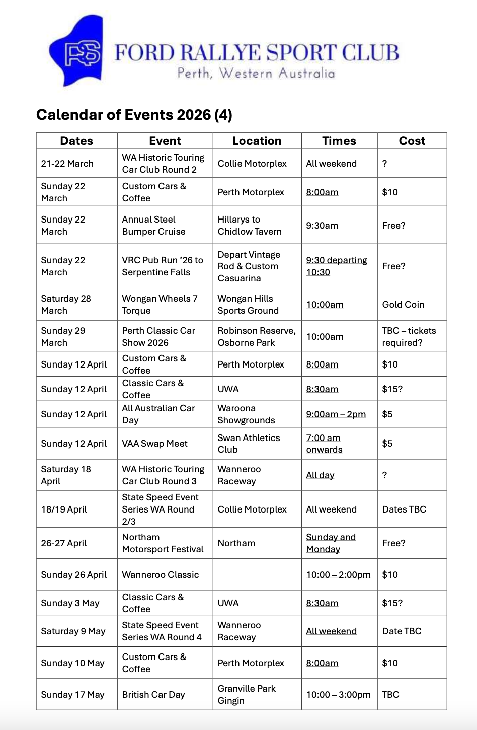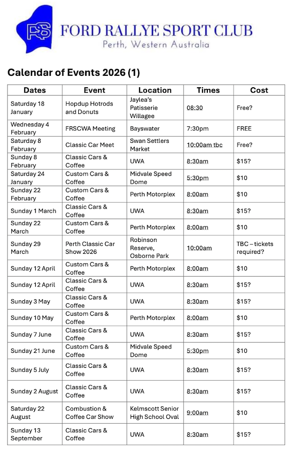 The Ford Rallye Sport Club is a small fords enthusiast club, we are a long standing Western Australian car club. Our monthly meetings are held at the Light Car Club Rooms in Moojebing Street Bayswater on the first Wednesday of the month (except January), starting at 7:30pm.